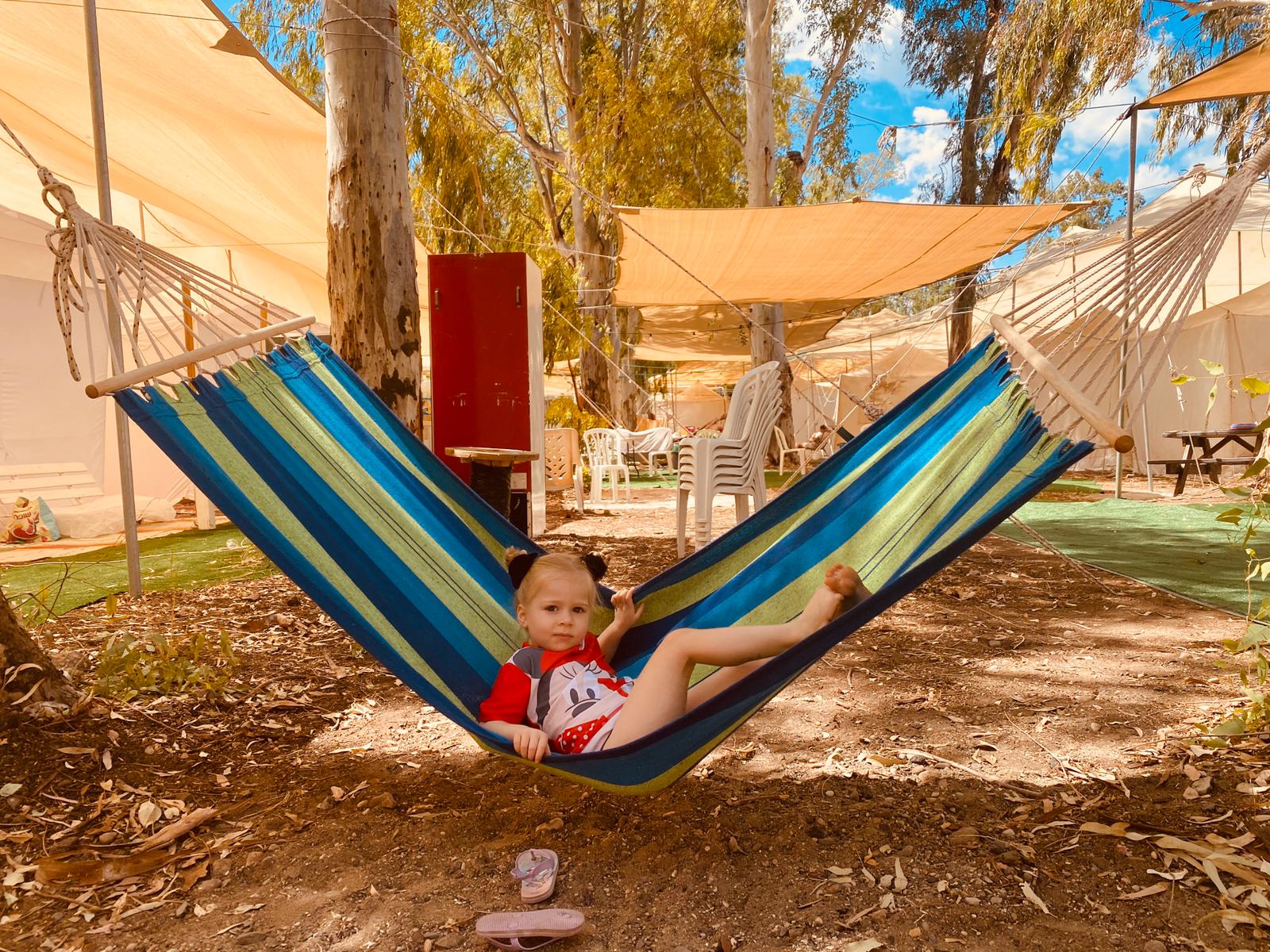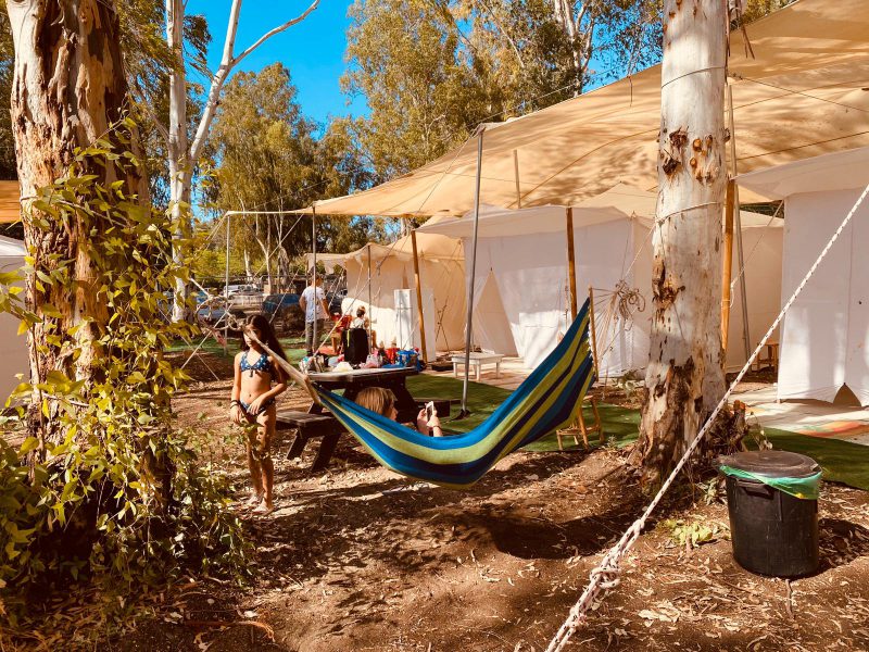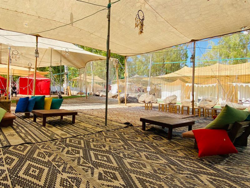 » כל אוהל מצוייד במזגן, מיטה זוגית, 2-3 מזרונים איכותיים (עם כיסוי מגן) על מחצלות, תאורה, נקודת חשמל להטענה של ניידים, מחצלת ופינת ישיבה מוצללת מחוץ לאוהל.